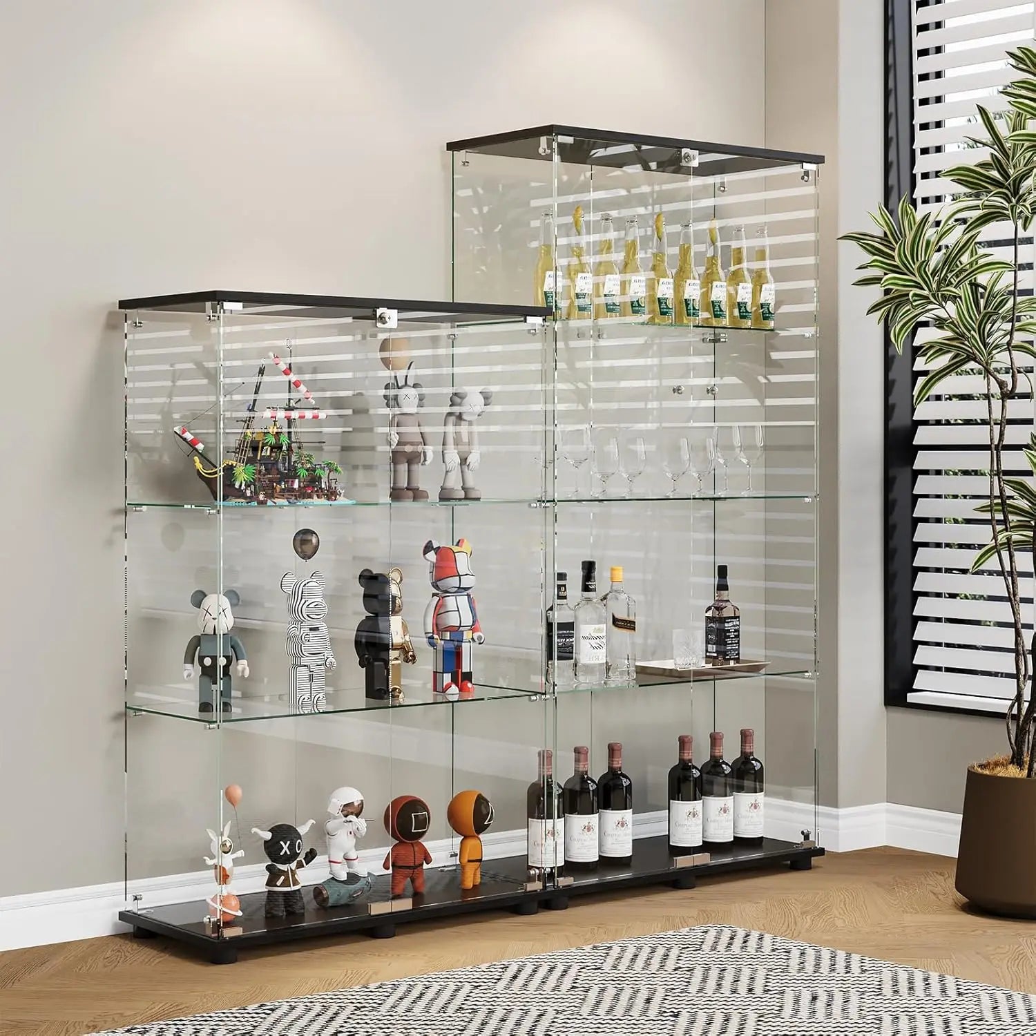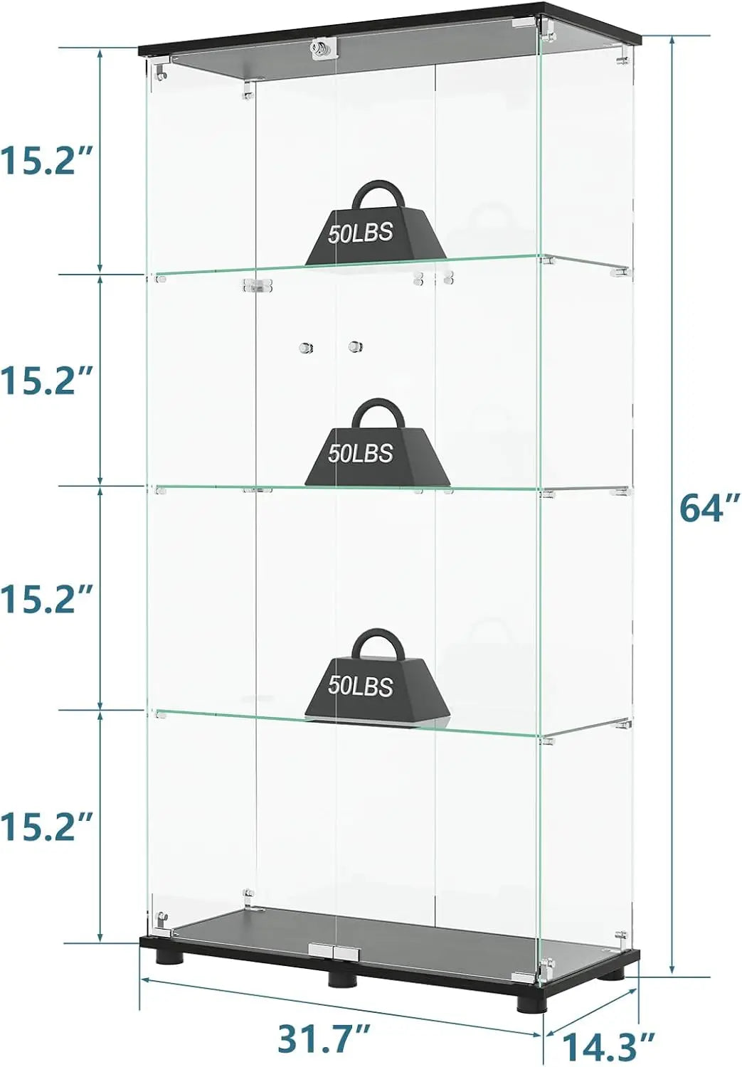 - with 2 door Glass Display Cabinet:Size 64”(H) x 31.7”(L) x 14.3”(W) inches, each tempered glass is 5mm thick. 4-shelf design is sturdy and stylish to display Jewelry, Bags, Shoes, Figures,photos, books, action figures, wine and whisky; glass door is easy to open and close