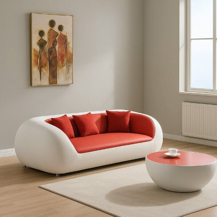 Discover the perfect balance of modern design and inviting warmth with this chic sofa. Its smooth white curves embrace bold red seating, creating a statement piece that transforms your living space into a haven of elegance and relaxation.