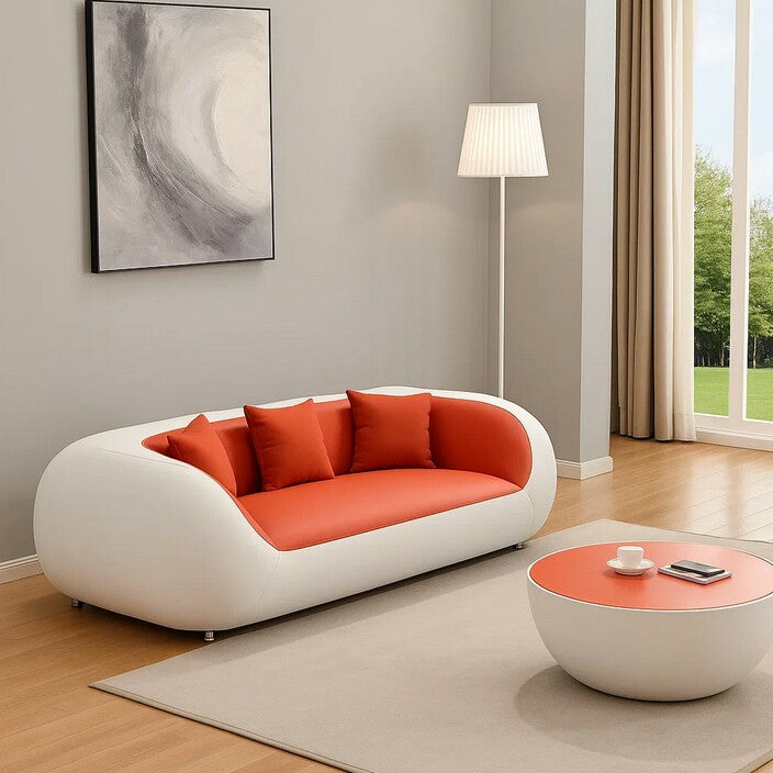 Elevate your living space with this sleek, contemporary sofa set featuring a smooth white frame and vibrant orange-red cushions. Its minimalist curves and bold color contrast bring both comfort and style, while the matching coffee table completes the look for a perfectly coordinated, modern interior.