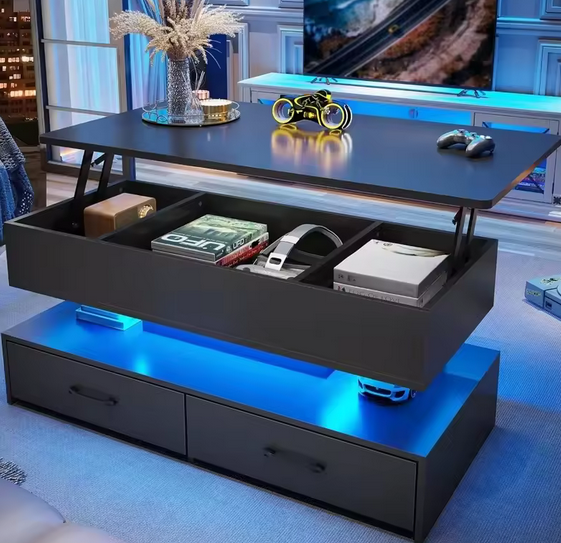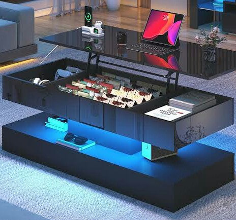This modern smart coffee table is more than just furniture — it’s a multifunctional hub for your living space. With a glossy black surface, hidden lift-top storage, LED lighting, and organized compartments, it blends style, convenience, and technology in one stunning centerpiece.