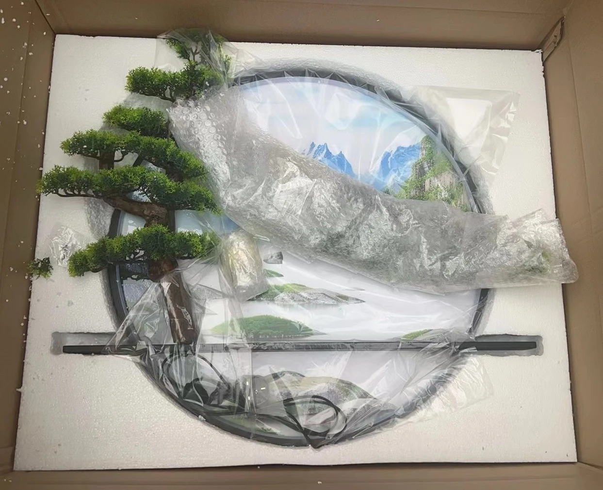 2. Color: Black or golden round frame; 3D green pine tree; color background picture.