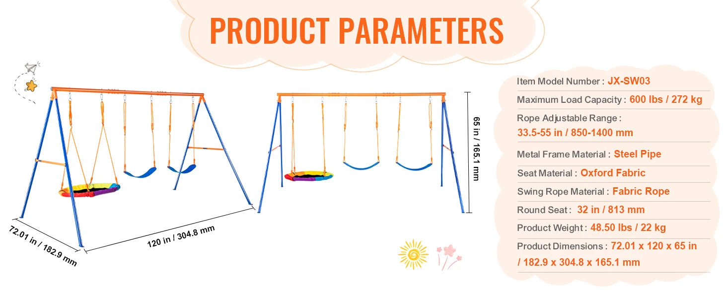 Premium Seat: Our swing sets for backyard come with a high-quality Oxford fabric seat, known for durability and colorfastness. They are resistant to wear and tear even after prolonged use. Adjustable high-quality PE ropes are sun-resistant and do not fade over the years.