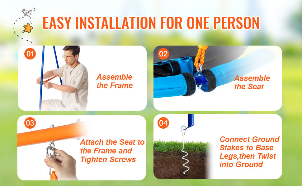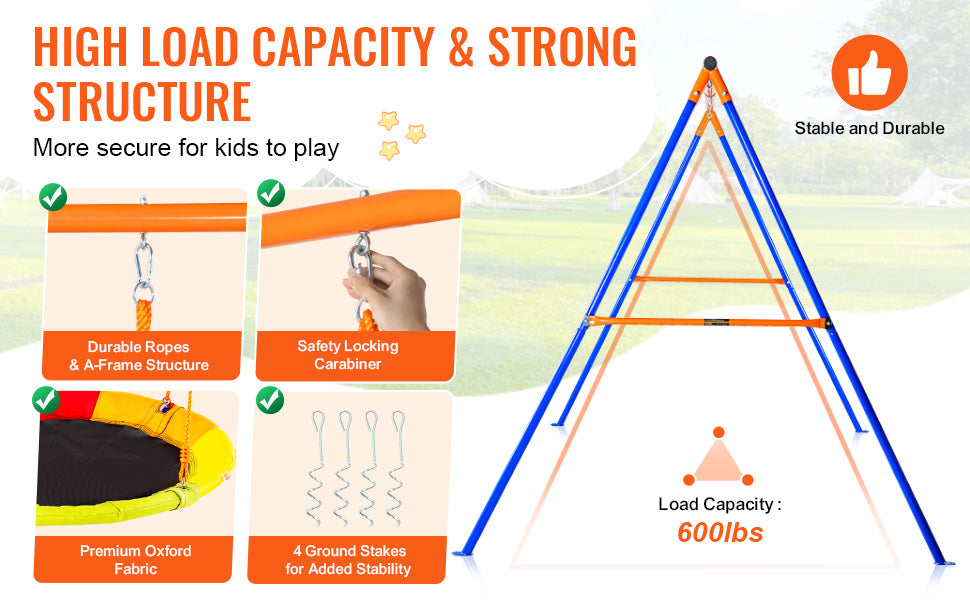 High Weight Capacity & Sturdy Construction: This A-frame swing set can support up to 600 pounds (272 kilograms), featuring a robust A-frame structure and sturdy ground stakes. Its triangular design enhances stability. Equipped with strong ropes and safety buckles to extend its lifespan.